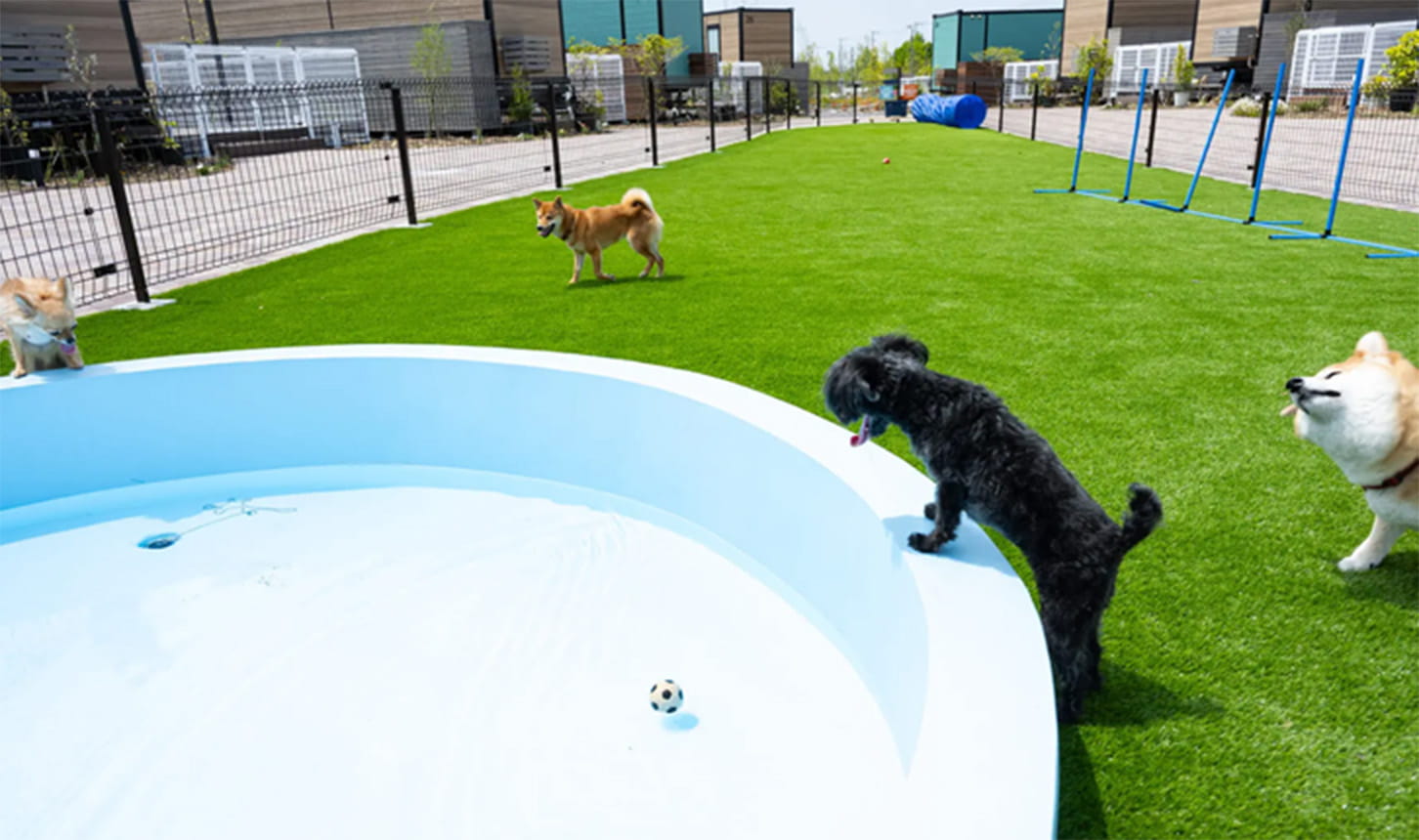 愛犬と思いきり遊べるドッグランにはワンちゃん用の遊具やじゃぶじゃぶ池も。