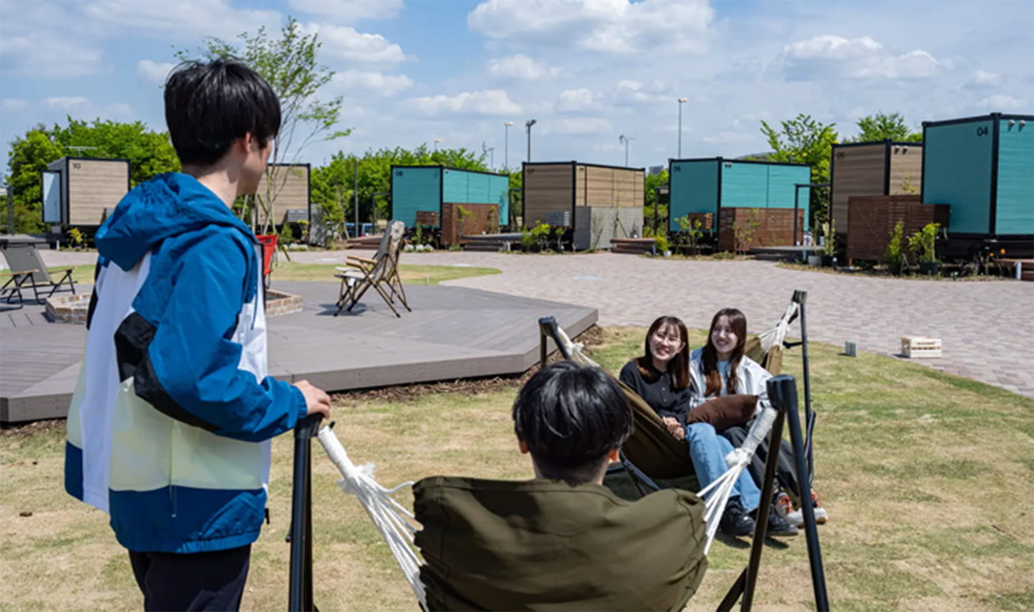 ファイヤーピットを囲みながらキャンプチェアでのんびり寛いだり、ポリパドルやモルックなどの貸出備品で遊んだり。