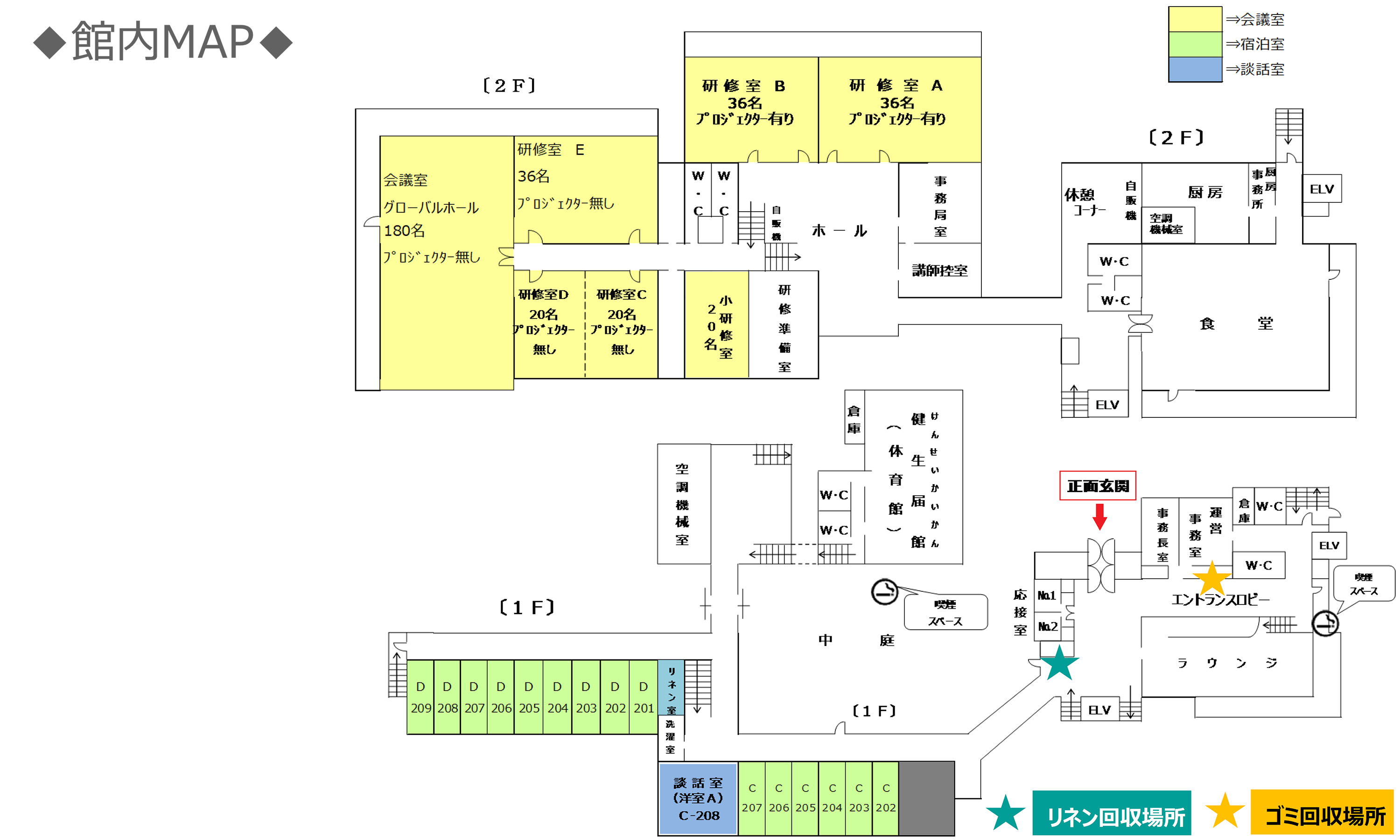 | チェックアウト時 | シーツ類:ロビーの回収場所までお持ち頂き、新しいものを入室時と同じように設置下さい。 タオル類:ロビーの回収場所までお持ち頂き、新しいものを入室時と同じように設置下さい。 布団類:畳んだ上で、入室時と同じように置いてください。 ゴミ:ロビーの回収場所までお持ち下さい その他:電気、空調を消し、入室時と同じ状態にし、鍵は空けたままルームキーを返却下さい。 |